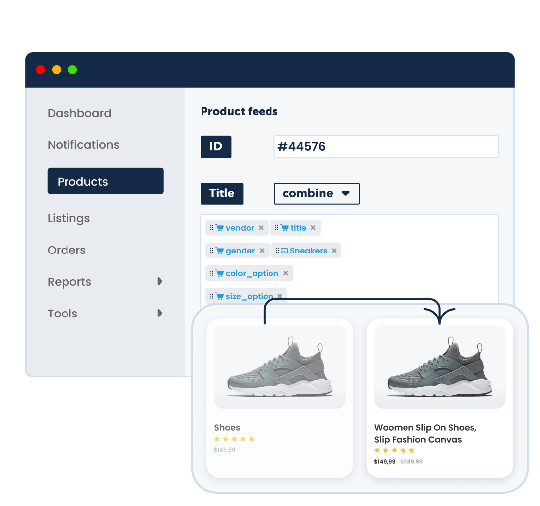 Sales channels use the data from product feeds to display items on their platforms. They check your eCommerce feed and decide if your products or your competitor's should show up for potential customers. To get in front of every customer it's crucial to have a channel feed optimization tool.
