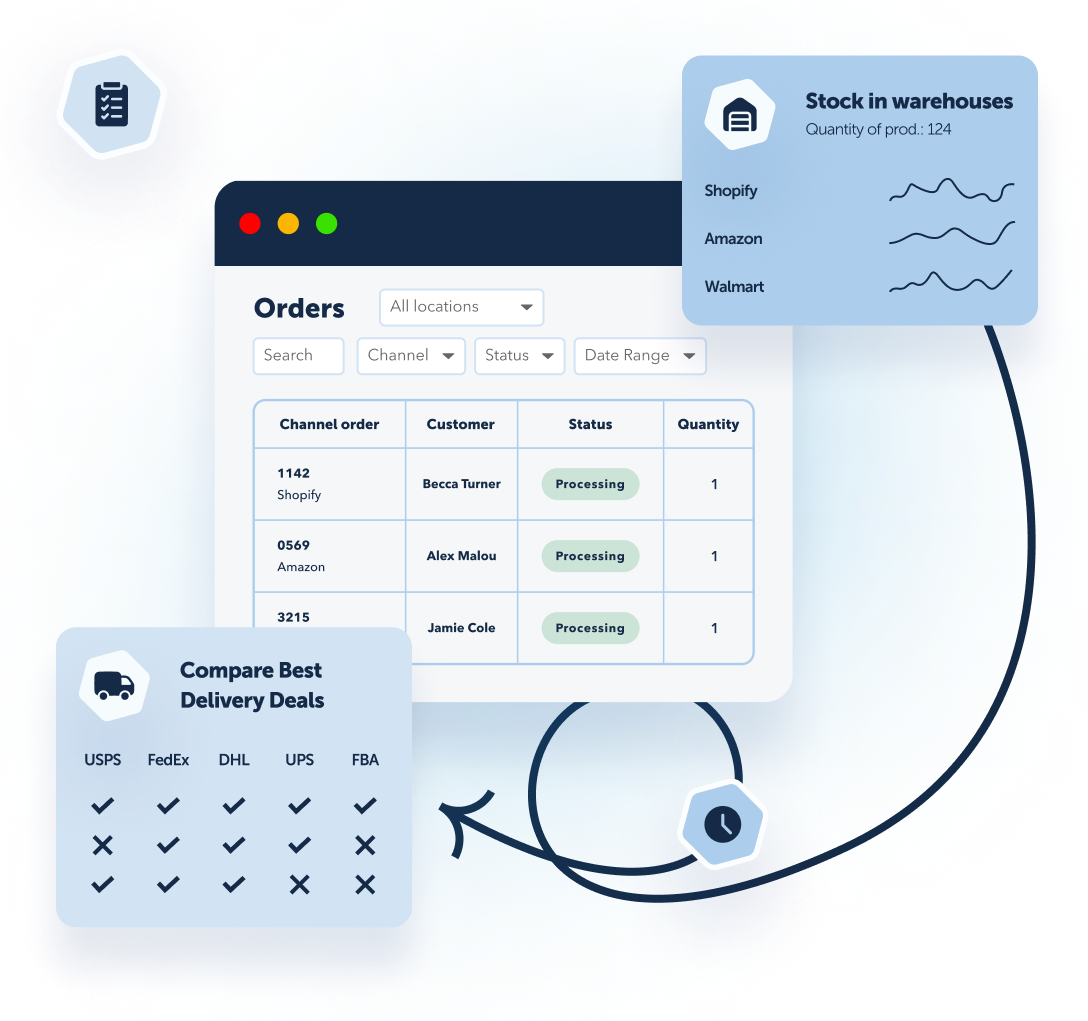 Centralized order tracking, for every channel you sell on, into a single location. Fulfill your orders, choose shipping options, or use automated order routing to send orders to third-party logistics companies like Fulfillment by Amazon (FBA) and Walmart Fulfillment Services (WFS).